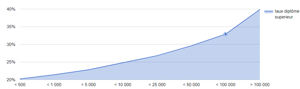 Sur le territoire national, la population diplômée se concentre sans surprise dans les grandes villes. Cependant, l’écart avec les petites villes est frappant. Les villes de plus de 100 000 habitants comptent une population diplômée de l’enseignement supérieur deux fois plus importante que dans les villages. L’éducation semble jouer un rôle déterminant dans cette répartition.