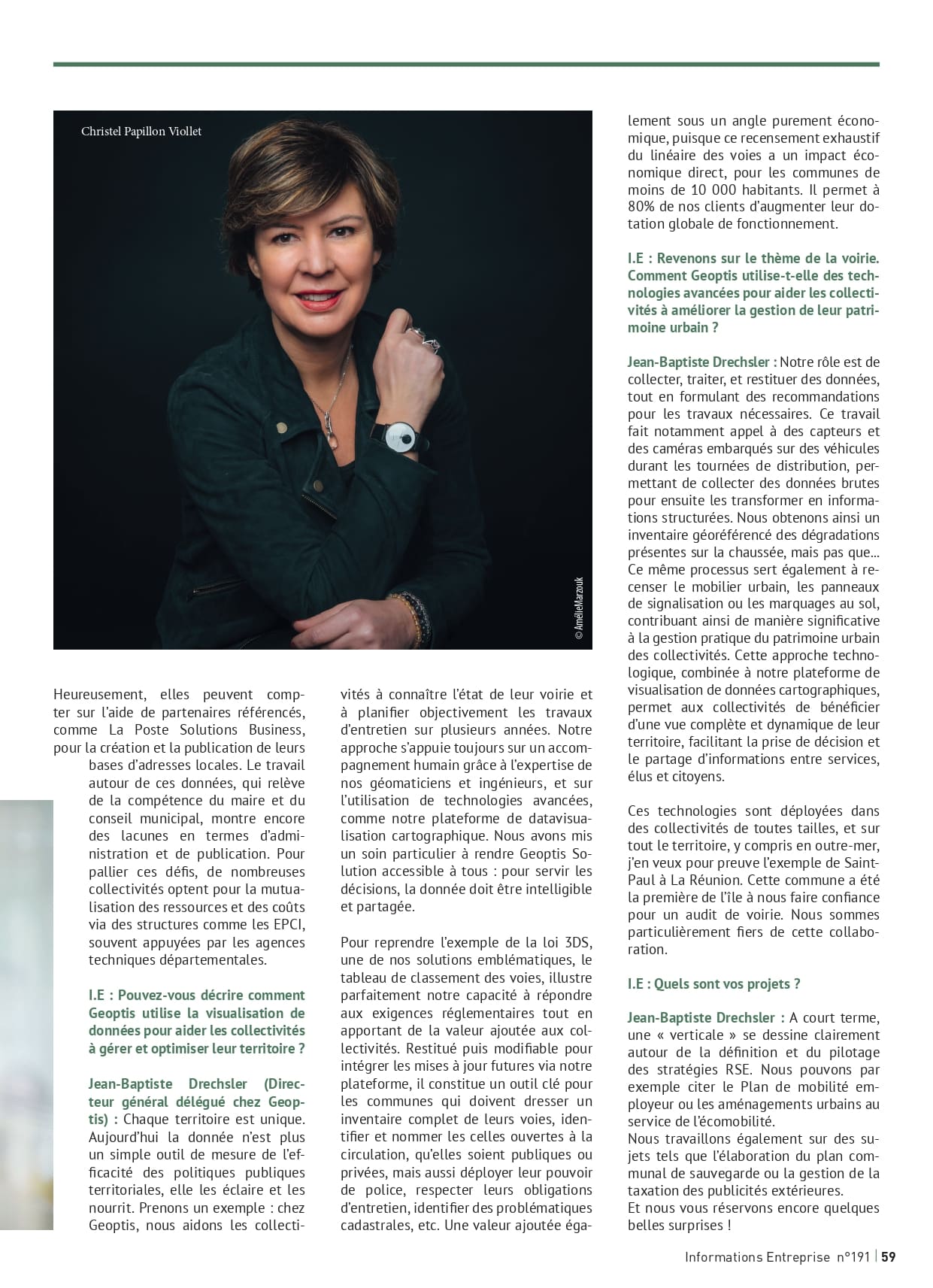 Christel Papillon Viollet, Directrice des Solutions et de l’Efficacité territoriale de La Poste et Présidente de Geoptis, et Jean-Baptiste Drechsler, directeur général délégué, nous en disent plus sur les enjeux de la data et du secteur public local dans un article paru dans Informations Entreprise n°191 de juillet- août- septembre 2024.