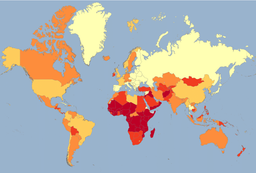 La carte de l’évolution démographique par pays en 2016 montre clairement où se situe les gisements de croissance : les pays Africains et du Moyen-Orient à plus forte dynamique connaissent une croissance entre +2,4% à +5,2% par an, quand le taux de croissance mondial s’établit à 1,2%.