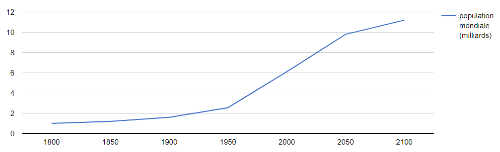 L’avènement de la révolution industrielle a marqué le début de la transition démographique. En 1927, 123 ans plus tard, la population mondiale atteignait 2 milliards d’individus. Ensuite, la croissance s’est accélérée : 33 ans pour atteindre 3 milliards en 1960, 14 ans pour 4 milliards en 1974, 13 ans pour 5 milliards en 1987, 12 ans pour 6 milliards en 1999, puis 7 milliards en 2011.